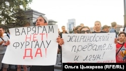 "Дегтярев – уходи!", "Мы тебя не звали!", "Иди в баню, Мишаня!", "Жириновскому – позор!", – дружно скандируют митингующие.