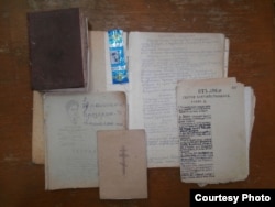 "Эти дописанные от руки книги, тетради акафистов и молитвословы, с обложками из картона от статистических отчетов Районного отдела здравоохранения - Райздрава - Санчурского района Кировской области взяты из одного сундука, принадлежавшего Августе Ивановне Севрюгиной (урожденной Самсоновой). Из сундука бабы Гути.
